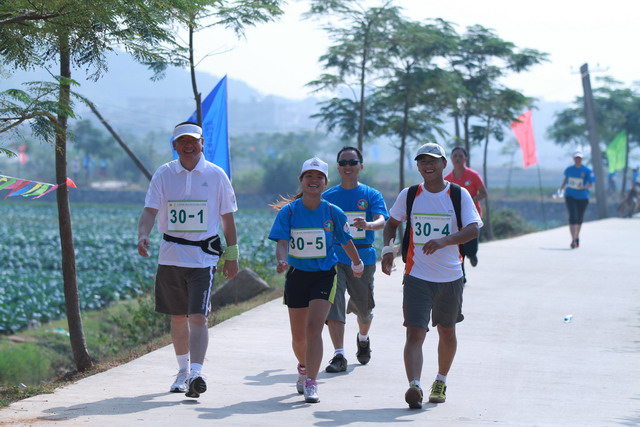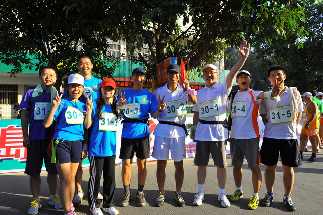 115,秋陽燦爛,大家早已躍躍欲試,隊中負(fù)責(zé)后勤的我,早在比賽前夕就廣發(fā)注意帖:速干短褲、帽子、腰包、水杯、小方巾、鞋子等物品需必備;作為隊伍領(lǐng)頭雁的齊總則早已咨詢專業(yè)選手,提倡大家結(jié)合自己體力準(zhǔn)備能量棒、巧克力等緊急能量品;隊長鄧總在了解路線和路況后,制定了“穩(wěn)重取勝”的戰(zhàn)略,采取了“準(zhǔn)備活動做充足,先慢后快求適應(yīng),不因外因亂陣腳,敵疲我追求成績”的具體戰(zhàn)術(shù);隊伍中的另一名隊員則帶來了他專業(yè)的GPS定位手表,分時段匯報所走路程、當(dāng)前速度適當(dāng)與否,并提前告知提速準(zhǔn)備;我們的女隊友亞梅,則一路保持微笑,緊跟隊伍,偶爾爆出的一些冷笑話,讓緊張趕路的我們倍感清爽。