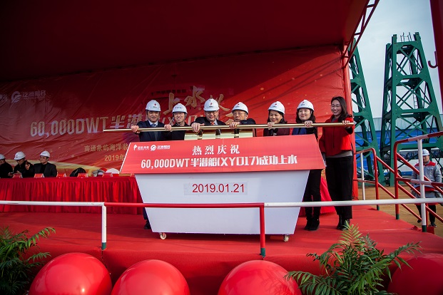 1月21日,由南通象嶼海洋裝備有限責(zé)任公司(以下簡稱“象嶼海裝”)建造的60,000DWT半潛船順利出塢。江蘇泛洲船務(wù)有限公司董事長江厥杰、中國科學(xué)院自動化研究所軍事顧問原海軍訓(xùn)練基地副司令員張錦榮、江蘇省交戰(zhàn)辦主任林有鎮(zhèn)、南京交通運輸局局長徐衛(wèi)國、中國船級社江蘇分社副總經(jīng)理張東標(biāo)、象嶼集團黨委委員、象嶼股份黨委書記、總經(jīng)理、象嶼海裝董事長鄧啟東等共計200多名各界人士參加了象嶼海裝60,000DWT遠(yuǎn)洋自航半潛船上水儀式。