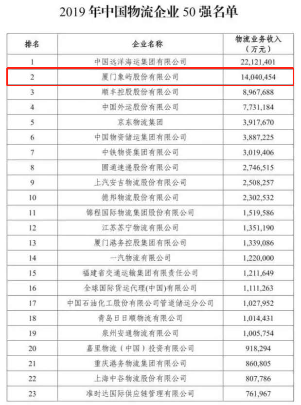今日,中國物流與采購聯(lián)合會公布了2019年度中國物流企業(yè)50強排名,象嶼股份蟬聯(lián)第2。