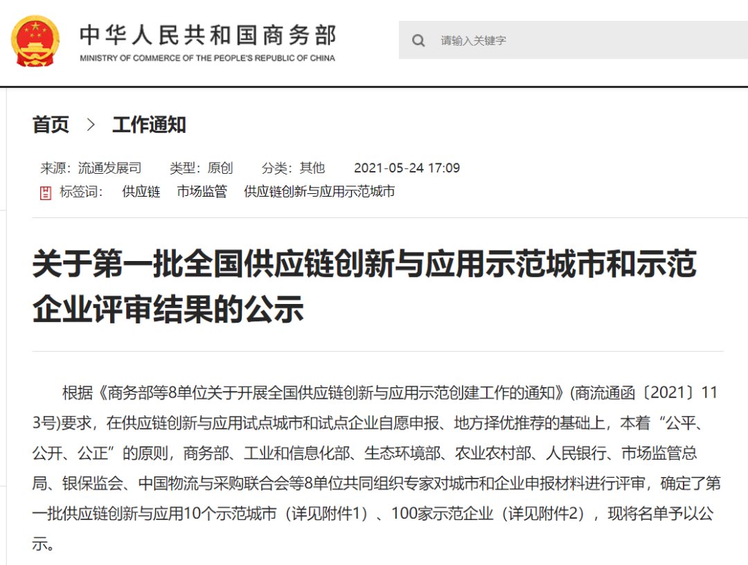商務(wù)部此次公示的“全國供應(yīng)鏈創(chuàng)新與應(yīng)用示范城市和示范企業(yè)評審結(jié)果”,是商務(wù)部、工業(yè)和信息化部、生態(tài)環(huán)境部、農(nóng)業(yè)農(nóng)村部、人民銀行、市場監(jiān)管總局、銀保監(jiān)會、中國物流與采購聯(lián)合會等8單位共同組織專家對城市和企業(yè)申報材料進(jìn)行評審確定的結(jié)果。