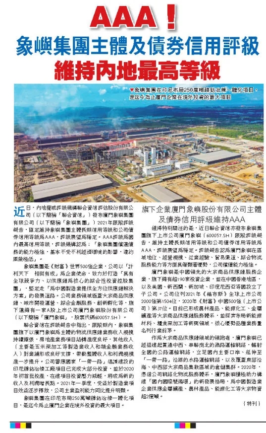 近年來(lái),象嶼積極響應(yīng)國(guó)家“一帶一路”倡議,在國(guó)際市場(chǎng)開(kāi)拓、跨境供應(yīng)鏈服務(wù)、國(guó)際化運(yùn)營(yíng)團(tuán)隊(duì)培育等方面不斷發(fā)力,象嶼國(guó)際化程度不斷提升引起了國(guó)際資本市場(chǎng)的廣泛關(guān)注。昨天,《大公報(bào)》、《香港經(jīng)濟(jì)日?qǐng)?bào)》、《大公網(wǎng)》、《經(jīng)濟(jì)通》等多家港媒,發(fā)文聚焦廈門(mén)象嶼集團(tuán)有限公司及旗下上市企業(yè)廈門(mén)象嶼股份有限公司主體及債券信用評(píng)級(jí)均維持國(guó)內(nèi)最高等級(jí)AAA,并詳細(xì)圍繞評(píng)級(jí)報(bào)告介紹了象嶼的業(yè)務(wù)板塊和發(fā)展前景。