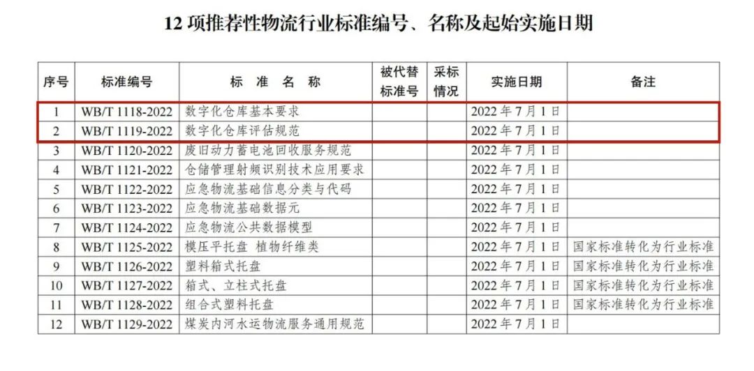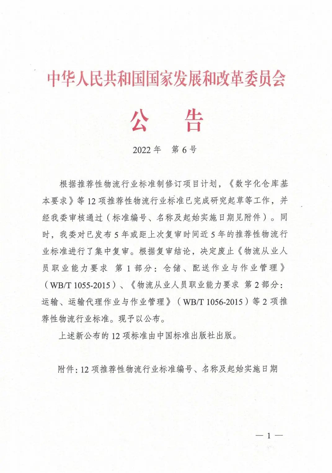 近日,中華人民共和國國家發(fā)展和改革委員會印發(fā)了2022年第6號公告,批準(zhǔn)發(fā)布12項(xiàng)推薦性物流行業(yè)標(biāo)準(zhǔn)。其中,由廈門象嶼股份有限公司參與編寫的《數(shù)字化倉庫基本要求》(WB/T 1118-2022)《數(shù)字化倉庫評估規(guī)范》(WB/T 1119-2022)2項(xiàng)推薦性物流行業(yè)標(biāo)準(zhǔn)于2022年7月1日正式實(shí)施。