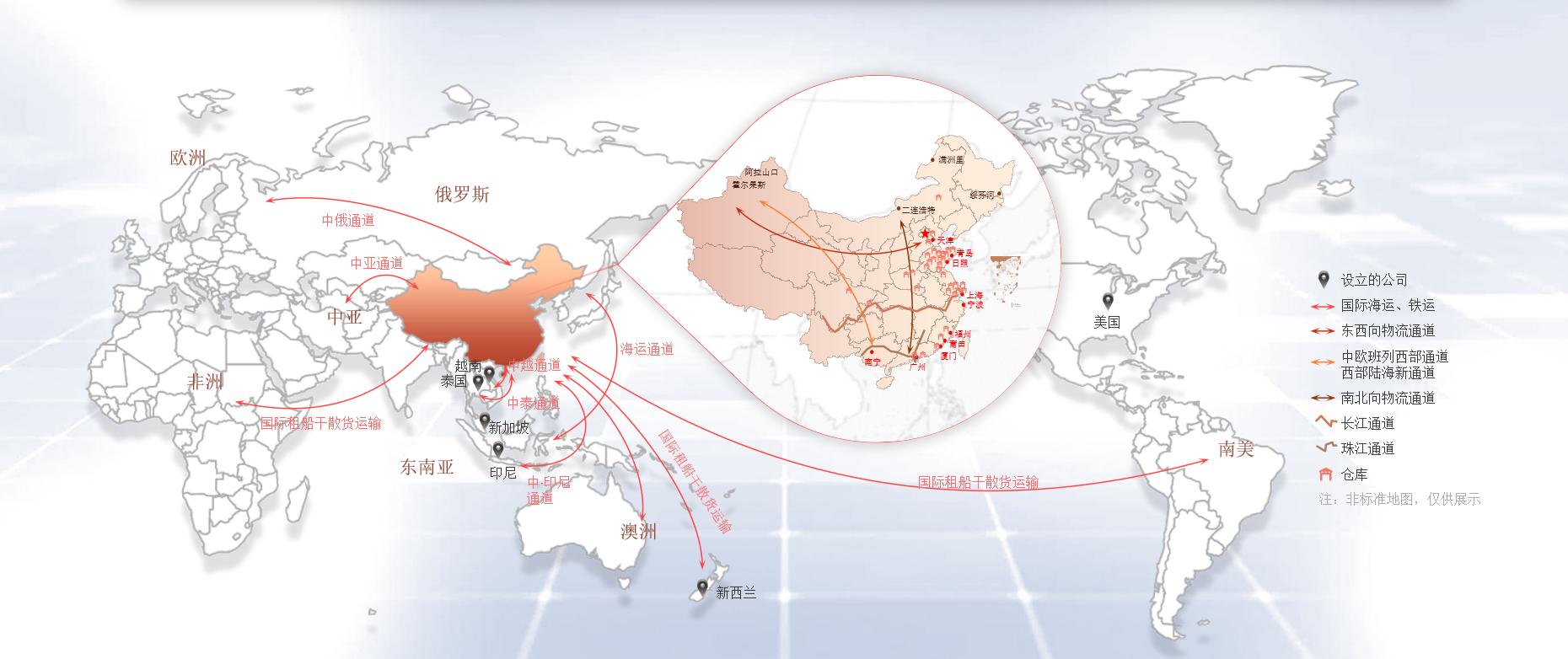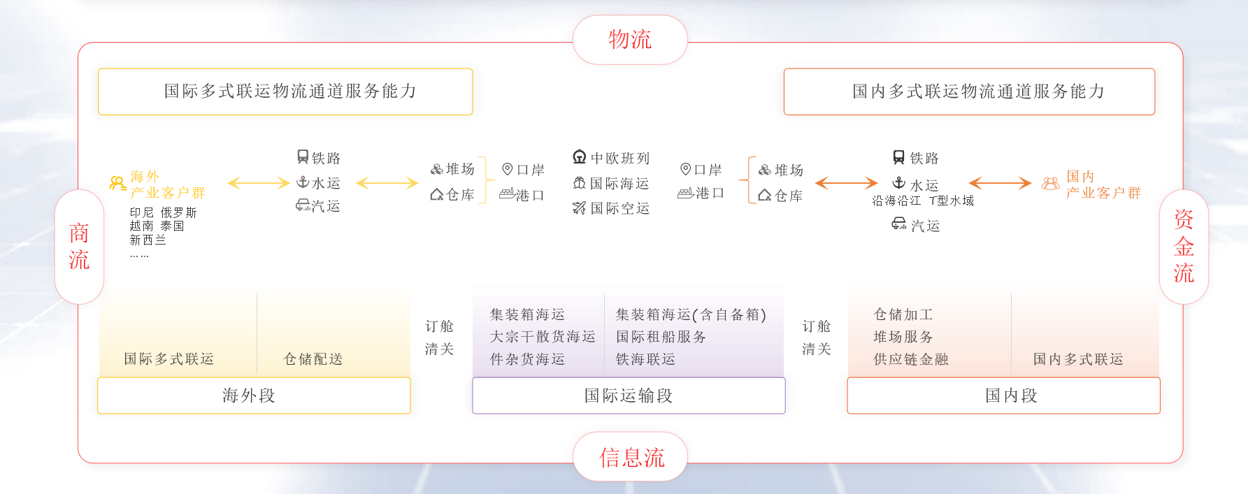 象嶼股份率先構建了以“公、鐵、水、倉”為支撐,覆蓋全國、連接海外的網絡化物流服務體系,并以“鐵、水”做干線、公路做兩端的經營思路,為客戶提供定制化多式聯運解決方案,實現一站式門到門運輸。目前,公司已經打造出“北糧南運”“鋁產品跨省流通”“北煤南運”等多條多式聯運物流線路。