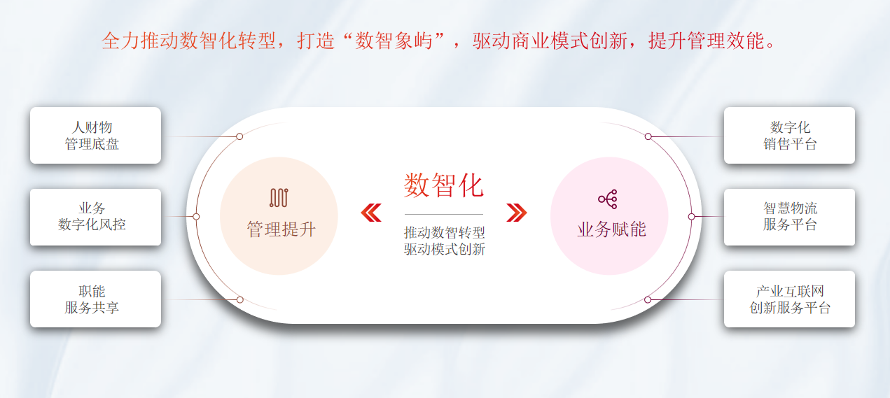 象嶼股份依托海量的業(yè)務數據、龐大的客戶資源、豐富的應用場景,積極推進數字化技術與業(yè)務的有效融合,并已落地農業(yè)產業(yè)級互聯網平臺、供應鏈金融服務平臺、智慧物流服務平臺、網絡貨運平臺4大重點項目,實現技術及商業(yè)模式升級。